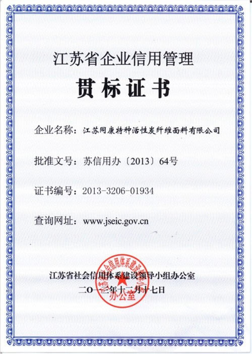 近日,同康公司通過江蘇省社會信用體系建設領導小組辦公室嚴格的審核評定,榮獲“江蘇省企業(yè)信用管理貫標企業(yè)”榮譽。